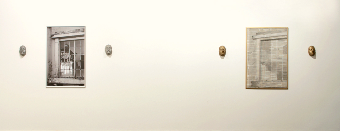 Janela I, fotografia (1,12 x 0,77 m) e máscaras de alumínio / Janela III, desenho sobre recortes do obituário (1,12 x 0,77 m) / máscaras de bronze.