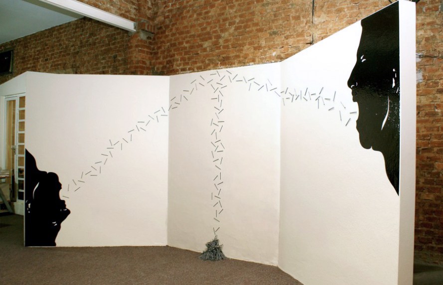 Instalação (vinil e pregos, 2,30m x 5,40m) Série Gárgulas 2010 – Exposição Empilháveis II, galeria Modernidade, Novo Hamburgo, RS.